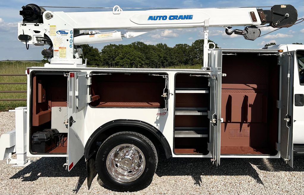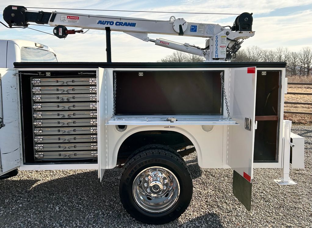 Check Out The Freshly Painted Industrial Grade Service Body. Custom Built Rear Bumper Work Station. Loaded with Pull Out Drawers and Storage ! Dual Out Riggers. Best in Class 5,000 LB. Auto Crane with Optional 3 Stage Progressive Boom. Wireless Crane Control.