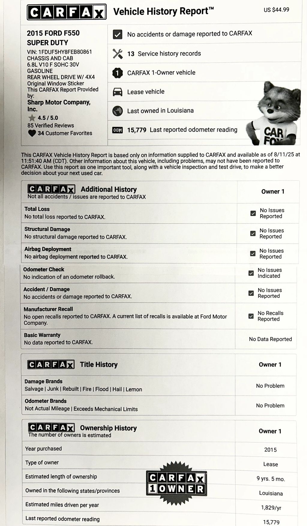 This is the Cleanest , LOWEST MILEAGE One Owner 2015 Ford F-550 4X4 Crane Service Truck in the COUNTRY ! Spent Most of it's Life in Storage in RUST FREE Louisiana. This is Not a Missprint. 15,000 Actual One Owner Miles.We have provided the CARFAX to Verify This !